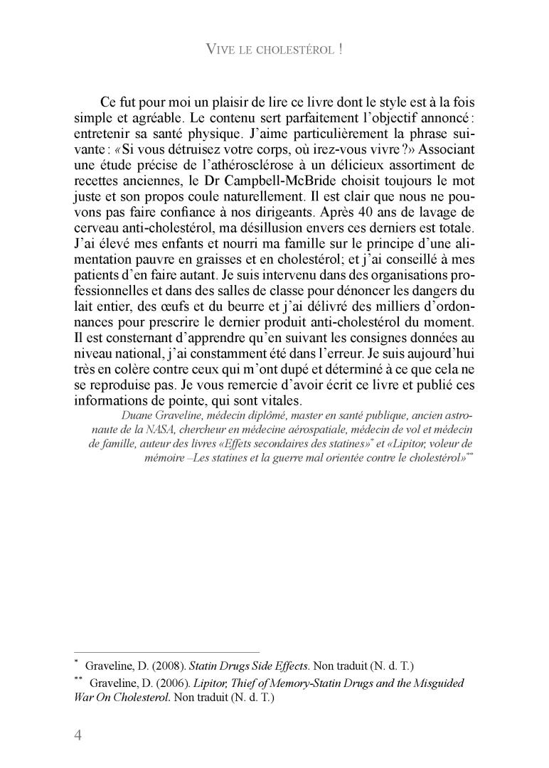 « Vive le cholestérol ! » nous offre non seulement un exposé facilement accessible, clair et bien écrit, mais aussi une stratégie pratique pour se prémunir contre la maladie cardiaque et recouvrer la santé, impliquant un retour aux aliments traditionnels et un refus des polluants environnementaux et des produits chimiques domestiques. En bonus, l’auteur nous dévoile ses recettes de cuisine dans un merveilleux chapitre ! « Vive le cholestérol ! » est une lecture obligatoire pour quiconque s’intéresse à l’alimentation et à la santé.