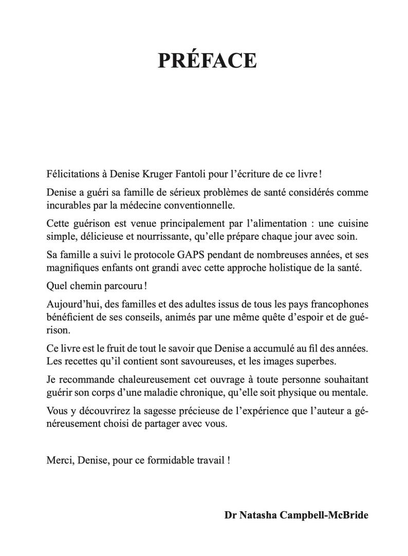 Qui dit livre GAPS de Natasha Campbell dit livre de Denise Kruger Fantoli aux éditions Nutrition Holistique. L’un ne va pas sans l’autre. Ce livre aide véritablement à mettre en pratique concrètement le régime GAPS. Donc un complément essentiel à avoir pour quiconque se jette dans ce régime.