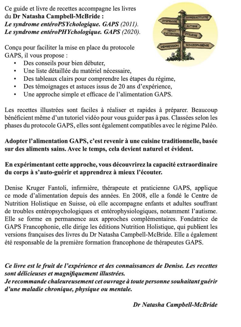 Ce livre des éditions Nutrition Holistique se veut une référence et un guide – afin de suivre le régime Gaps ( il faut se procurer le régime GAPS aussi car il y a plusieurs références que vous devez consulter )