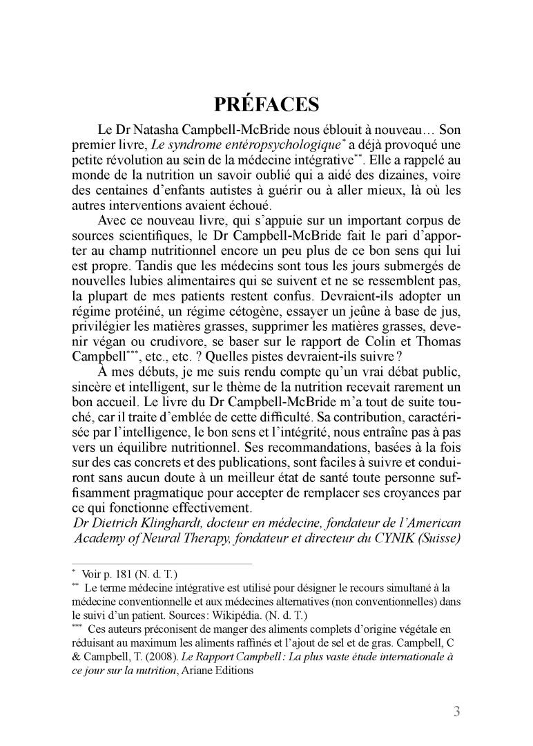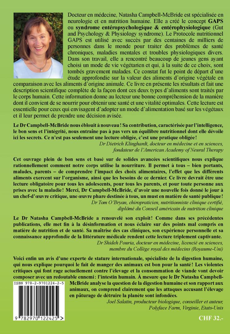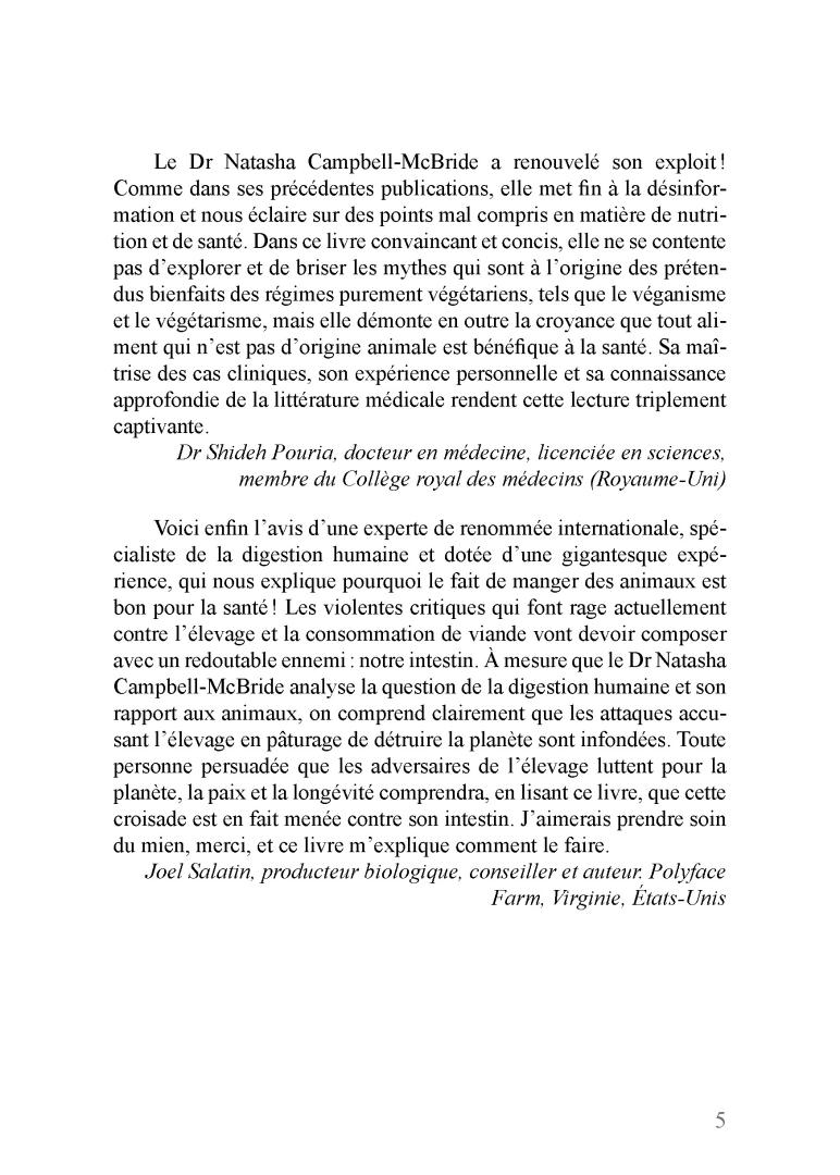 Cet ouvrage plein de bon sens et basé sur de solides avancées scientifiques nous explique rationnellement comment notre corps utilise la nourriture. Il permet à tous – bien portants, malades, parents – de comprendre l’impact des choix alimentaires, l’effet que les différents aliments exercent sur l’organisme, ainsi que les besoins de ce dernier. Ce livre devrait être une lecture obligatoire pour tous les adolescents, pour tous les parents, et pour toute personne aux prises avec la maladie ! Merci, Dr Campbell-McBride, d’avoir une nouvelle fois donné le jour à un chef-d’œuvre critique, une œuvre phare destinée à tous, un must en matière de santé publique !